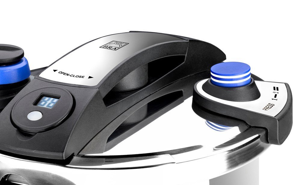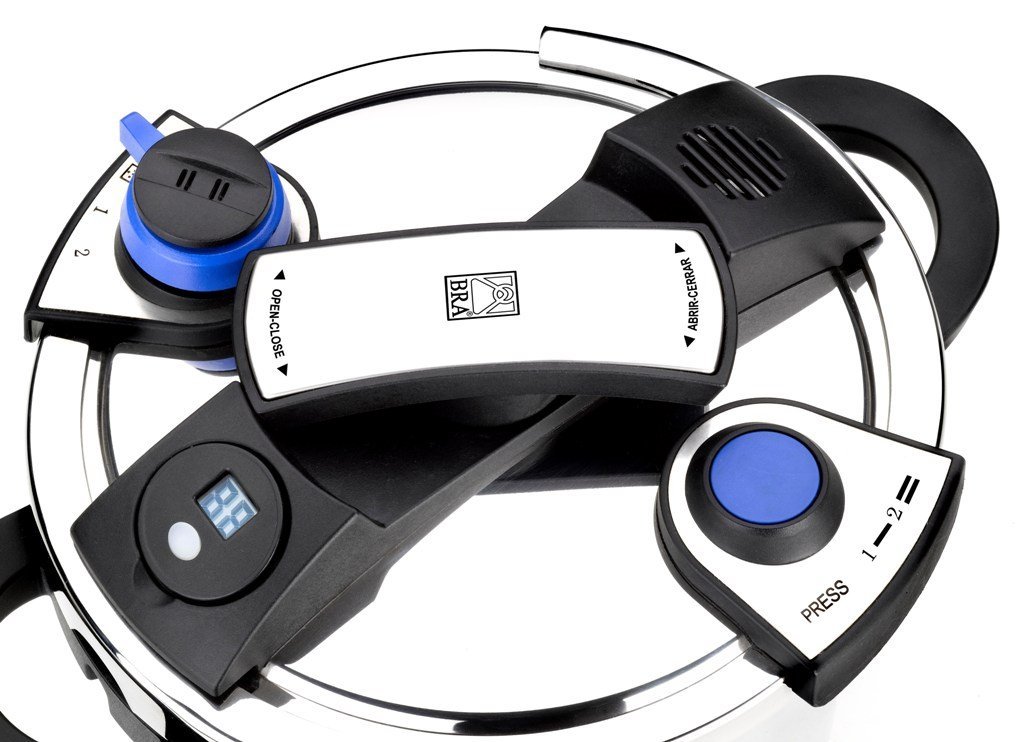 Si podemos destacar algo de la Olla Bra Facile es que posiblemente tenga una de las tapas de cierre más complejas del mercado, en la que se compone de un selector de presión, indicador de presión por anillos, pomo de apertura y cierre, válvula de funcionamiento, válvula de seguridad para la presión y temporizador.